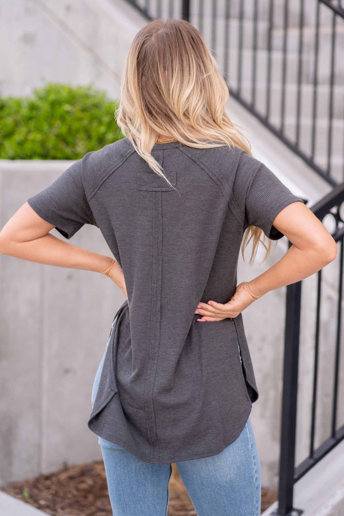 Zenana Split Hem Waffle Knit Short Sleeve Top Ash Grey American Blues